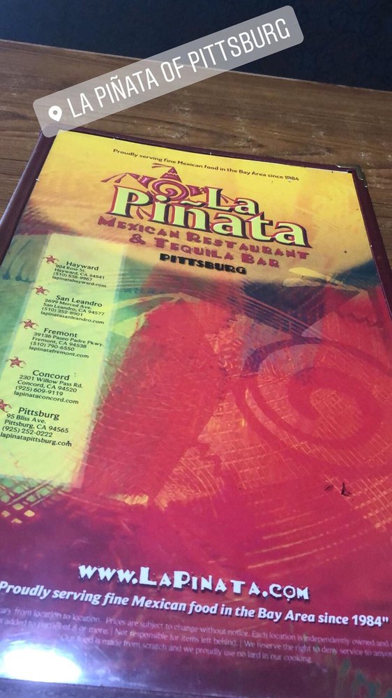 La Piñata is a Mexican restaurant located in Pittsburg, CA, offering a wide range of authentic dishes and beverages. With options for vegetarian and meat lovers alike, La Piñata provides a casual dining experience with various amenities like free Wi-Fi, outdoor seating, and a full bar. The menu includes classic Mexican favorites such as tacos, enchiladas, tamales, and quesadillas, all made with fresh ingredients and flavorful seasonings. Customer reviews rave about the top-shelf margaritas, the generous portions, and the friendly service. Whether you're craving a cheesy enchilada or a crispy chimichanga, La Piñata has something to satisfy your taste buds. Don't miss out on their happy hour specials and Taco Tuesday deals for a budget-friendly yet delicious dining experience. Visit La Piñata for a flavorful taste of Mexico in the heart of California.